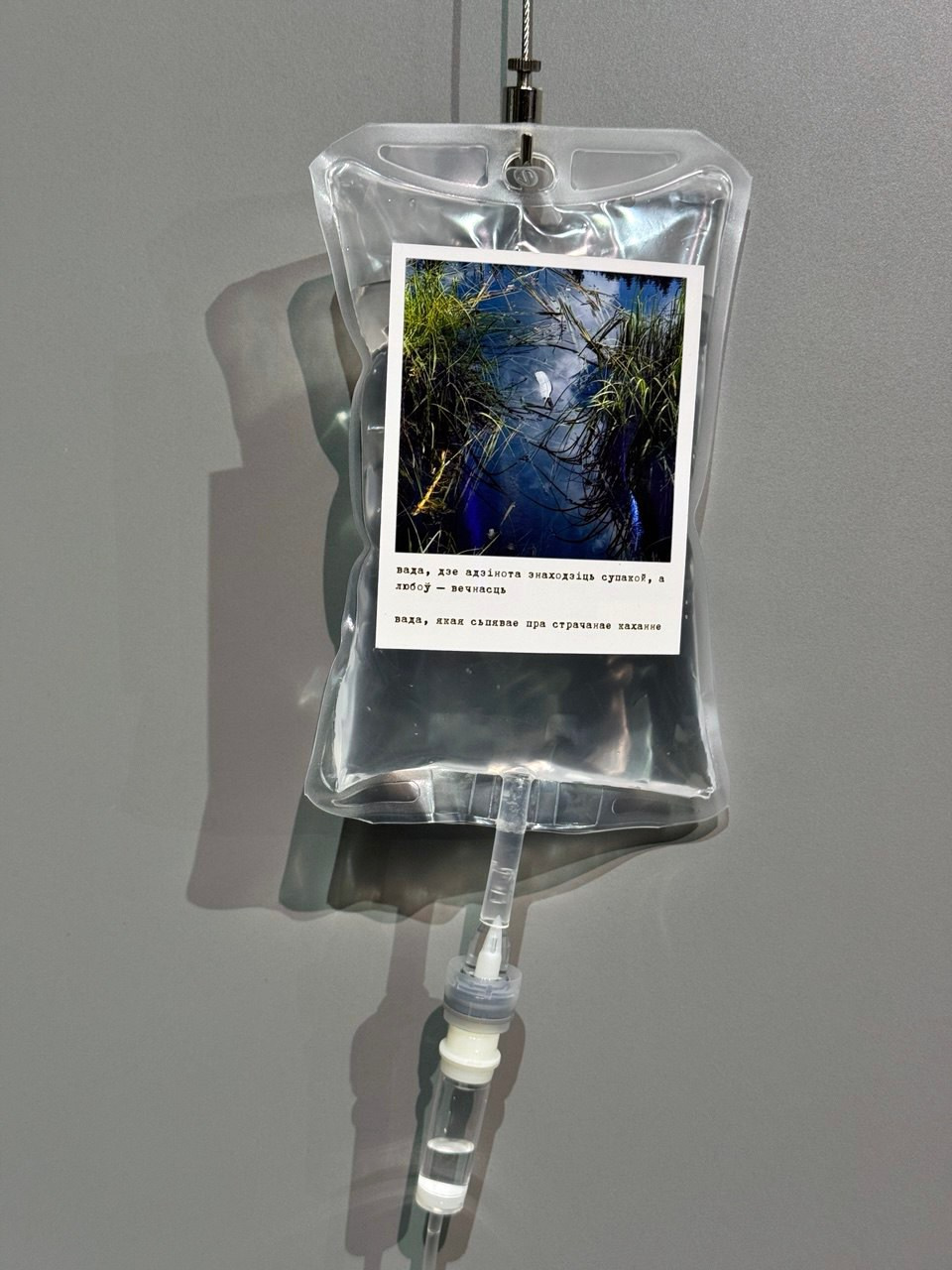 The integration of imagery and text creates a multi-layered narrative where visual information is deepened by reflection. The presentation of these works on IV drip sets is deeply symbolic. As a tool for precise, gradual impact and healing, the IV drip underscores the restorative power of both the diary and water itself. Each drop, imbued with images and words, represents a moment of cleansing and peace and reminds us that recovery requires time and attention to detail. This meditative installation invites the viewer into a space of quiet restoration, found in the depths of both the self and the natural world.